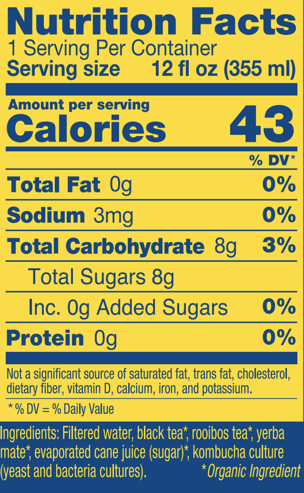 Ingredients: Filtered water, kombucha culture (yeast and bacteria cultures), organic black tea, organic white tea, organic rooibos tea, organic yerba mate, organic evaporated cane juice (sugar)